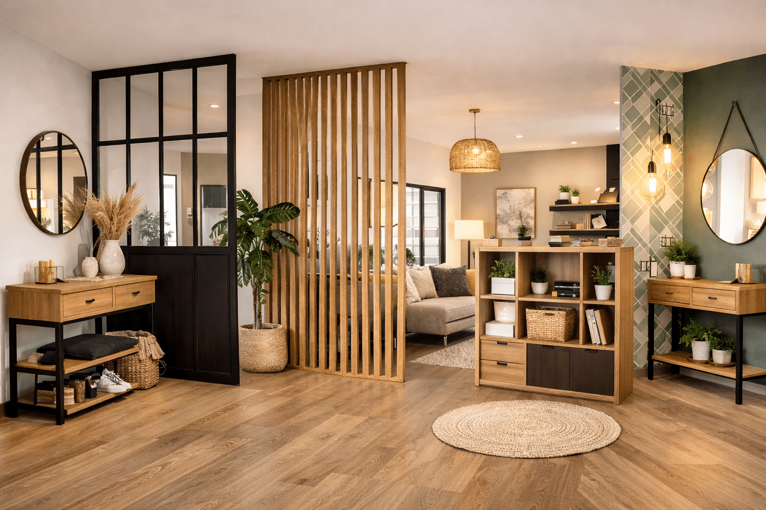 Un meuble bas, une console, une bibliothèque ouverte ou un banc avec rangements peuvent créer une frontière naturelle entre l’entrée et le salon.